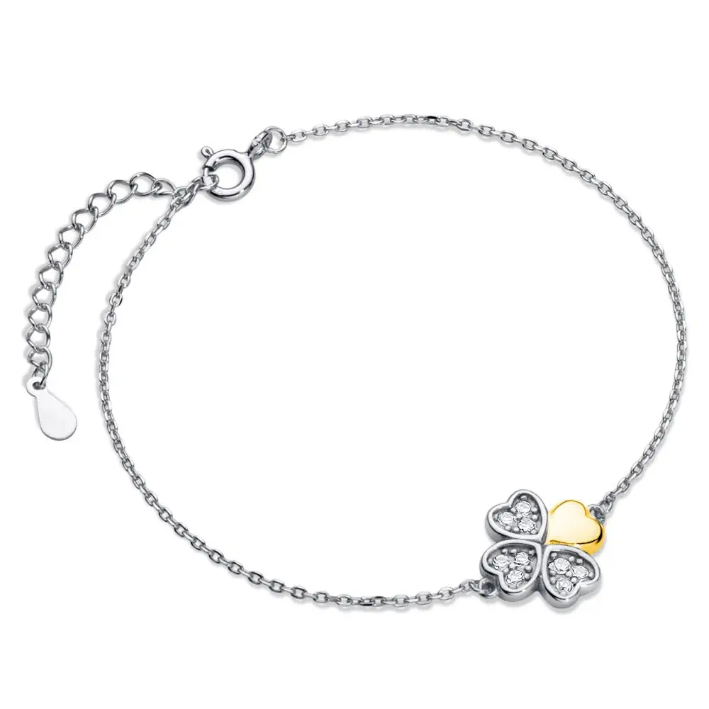 Entdecke das wunderschöne Armband "Aria" – ein zeitloses Schmuckstück, das Liebe und Glück in perfekter Harmonie vereint. Dieses exquisite Armband besteht aus hochwertigem 925 Sterling Silber und besticht durch seinen einzigartigen Anhänger, der aus vier Herzen in Form eines Kleeblatts gestaltet ist. Jedes Herz hat seine eigene Bedeutung und Schönheit: Drei Herzen sind kunstvoll mit funkelnden Zirkonia-Steinen besetzt, die im Licht strahlen und deinem Handgelenk einen Hauch von Glamour verleihen. Das vierte Herz ist in edler 18k Gelbgold-Vergoldung gehalten und setzt einen luxuriösen Akzent.