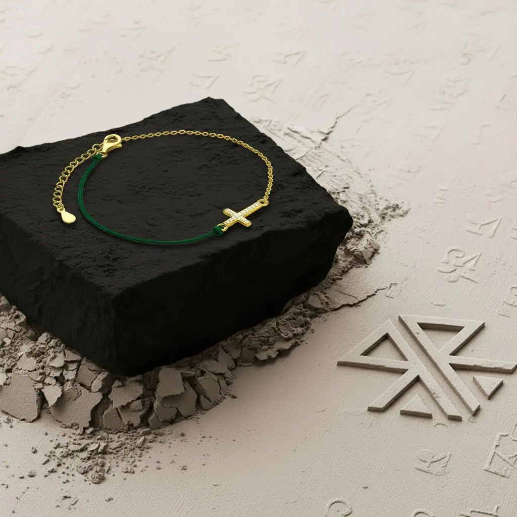 Entdecke das stilvolle Armband "Aurelia" – ein einzigartiges Schmuckstück, das Eleganz und tiefere Bedeutung in perfekter Harmonie vereint. Dieses exquisite Armband besteht aus hochwertigem 925 Sterling Silber und ist in edler 18k Gelbgold-Vergoldung gehalten. Die Kombination aus einer robusten, grünen Nylonband und einem kunstvoll gestalteten vergoldetem Sterling Silber Kreuz-Anhänger mit Zirkonia Steinen verziert, verleiht dem Armband eine moderne und gleichzeitig zeitlose Ausstrahlung.