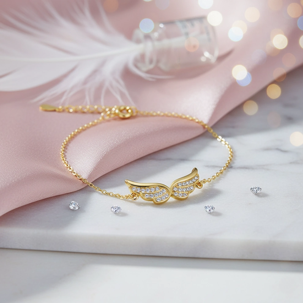 Entdecke das atemberaubende Kettenarmband "Bailey" – ein Schmuckstück, das Eleganz, Stil und eine tiefere Bedeutung in perfekter Harmonie vereint. Dieses exquisite Armband ist mit einem zentralen Anhänger in Form von Engelsflügeln ausgestattet, die kunstvoll mit funkelnden Zirkonia-Steinen verziert sind. Die Flügel symbolisieren Schutz, Freiheit und die Verbindung zu höheren spirituellen Ebenen. Sie erinnern uns daran, dass wir stets von Liebe und Licht umgeben sind, und inspirieren uns dazu, unsere Träume und Ziele zu verfolgen.