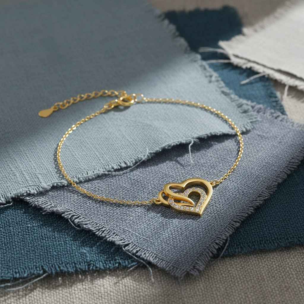 Entdecke das zauberhafte Armband "Quinn" – ein elegantes Schmuckstück, das nicht nur durch seine exquisite Verarbeitung besticht, sondern auch eine tiefere Bedeutung trägt. Dieses hochwertige Armband ist aus feinstem 925 Sterling Silber gefertigt und mit einer luxuriösen 18k Gelbgold-Vergoldung veredelt. Der zentrale Anhänger in Form von zwei harmonisch verschmolzenen Herzen symbolisiert die untrennbare Verbindung zwischen zwei Seelen.