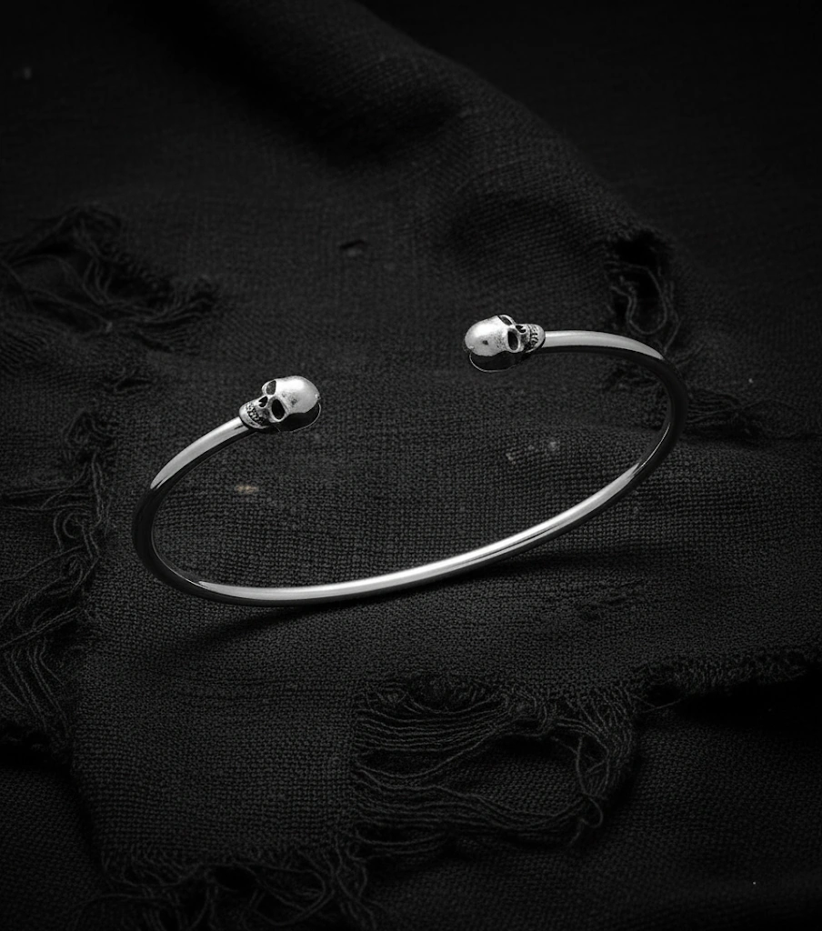 Entdecke den faszinierenden Armreif "Viska" – ein stilvolles Accessoire, das nicht nur durch sein außergewöhnliches Design besticht, sondern auch eine tiefere Bedeutung trägt. Gefertigt aus glänzendem 925 Sterling Silber, ist dieser Armreif mit kunstvoll gestalteten Totenköpfen an beiden Enden versehen. Diese einzigartigen Details verleihen dem Schmuckstück einen extravaganten Look, der sowohl für Damen als auch für Herren perfekt geeignet ist.