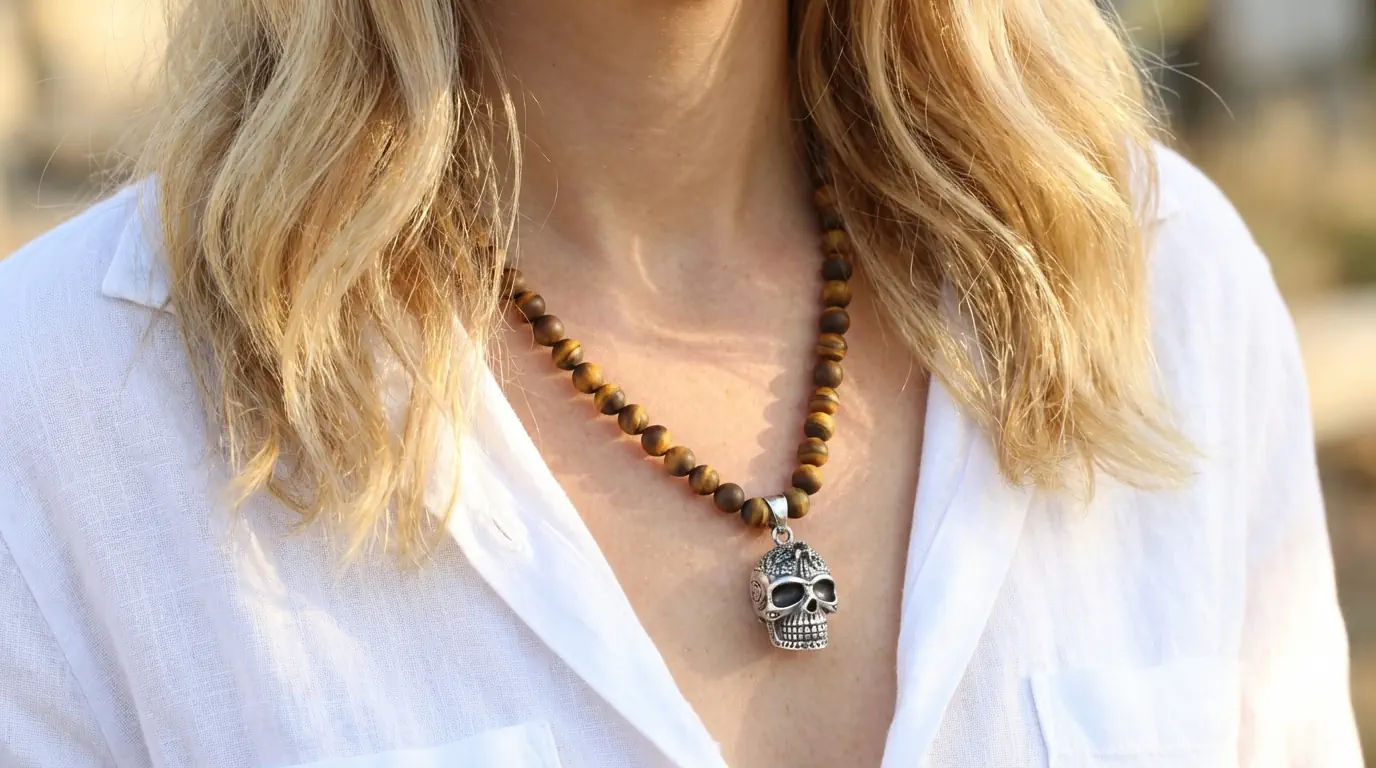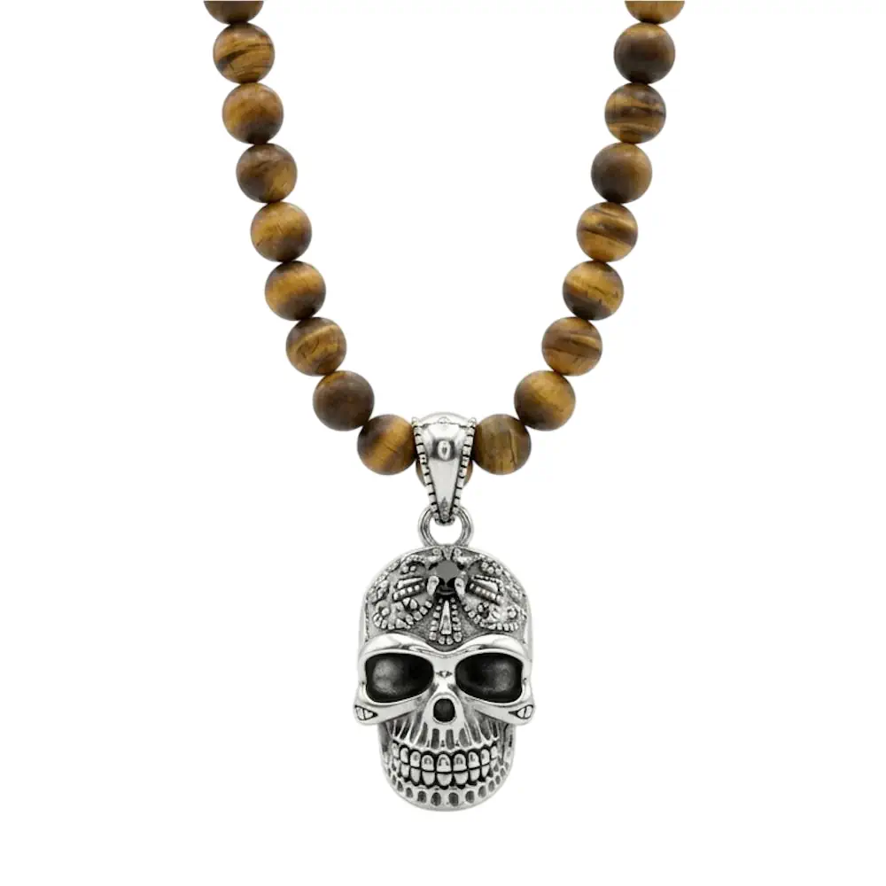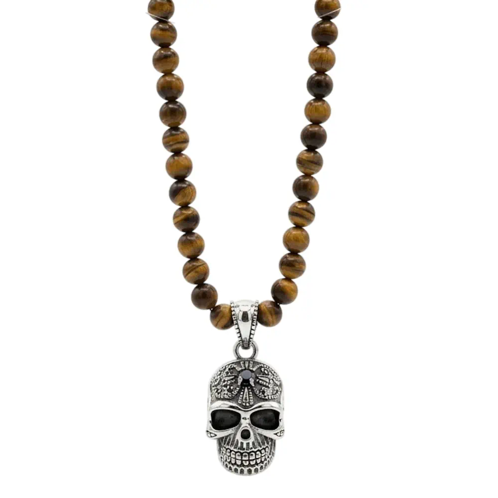Unsere handgefertigte , lässige und absolute alltagstaugliche Alvarr-Silver Halskette im Bikerstyle ist genau das richtige um sich von der Masse abzuheben! Durch die mattenfrosted Tigerauge Steinperlen kombiniert mit den SterlingSilber Totenkopf Anhänger unterstreichst Du Deinen Bad-Look. Die Halskette ist in Aufwendiger Makramee Technik hergestellt und braucht daher kein Verschluss ,lässt sich einfach anlegen. Durch das angenehme Tragegefühl wird sie schnell zu deinem Lieblingsstück. Ein tolles Design für echte Biker und Rocker unter euch. Egal ob über dem T-Shirt, unter einem Hemd oder der Lederjacke, bei Events oder im Alltag, eine Halskette mit der Du auffällst.Das Tigerauge gilt aufgrund seiner einzigartigen Färbung als kraftvoller Talisman. Zudem kann das Tigerauge als Schutzstein auch für eine Stabilisierung und Erdung des Trägers sorgen.Schützender Totenkopf Talisman für Kraft. Energie. Lebenslust!