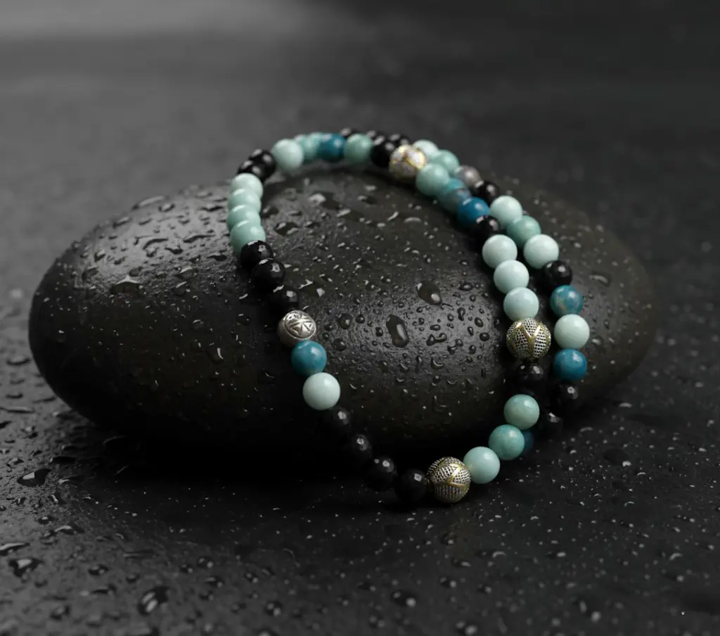 Du suchst das Besondere? Hier bist du richtig. Mit unserer handgefertigten Duncan Halskette bieten wir dir ein einzigartiges Design. Die Sterling Silber Elemente sticht dem Betrachter sofort ins Auge. Die zeitlosen Farben der hochwertigen Amazonit, Apatit und Onyx Steinperlen zeigen, dass du Wert auf Qualität & Einzigartigkeit legst. Mit der eleganten Duncan Halskette zeigst du Anderen gerne deinen lockeren Lifestyle. Sie passt zu jeder Situation und kann mi vielen Outfits getragen werden insbesondere mit dem Ibiza - Boho Style. Unsere Duncan Halskette wird gerne von Frauen und Männern getragen, denen ausdrucksstarker Schmuck gefällt.Die Halskette ist in Aufwendiger Makramee Technik hergestellt und braucht daher kein Verschluss ,lässt sich einfach anlegen.