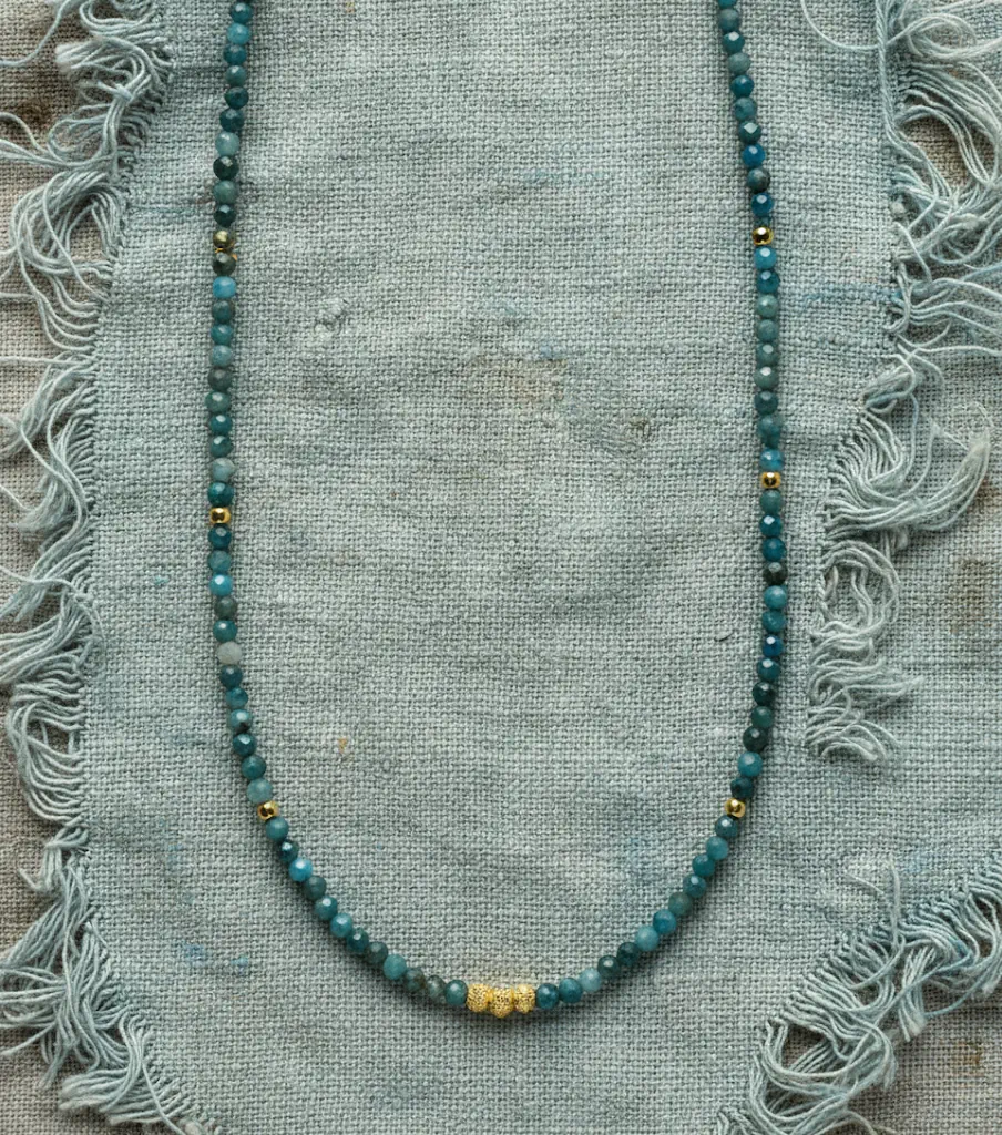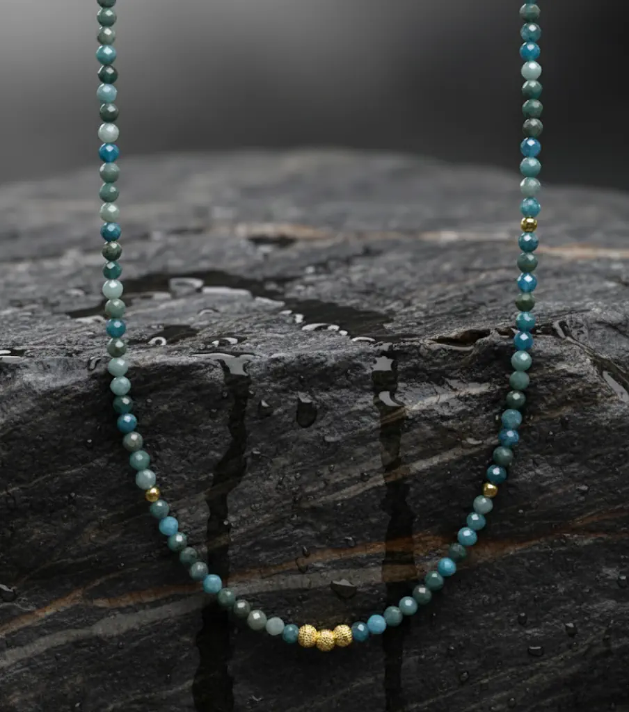 Die handgefertigte Perlenhalskette ist mit seinen facettierten Apatit und Amazonit Steinen und mit 18 Karat Gelbgold vergoldete Sterling Silber Perlen veredelt und sorgt so für schöne Akzente. Dieses symbolträchtige Schmuckstück verwandelt sich schnell zum neuen Lieblingsaccessoire. Ein Unverzichtbares Must-have. Klare Formen und die prägnante Designsprache machen diese Halskette zum beliebten Alltagsschmuck, welches sich auch zu festlicher Kleidung behaupten kann. Dieser hochwertige Schmuck sorgt für perfekten Tragekomfort. Ob einzeln oder in Kombination mit weiteren Schmuckstücken – dieses elegante Stück macht das Schmuckstyling perfekt! Ein absoluter Hingucker!