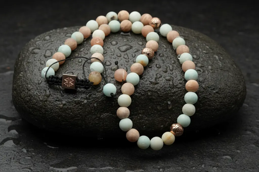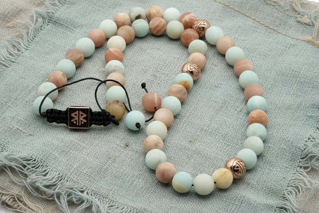Du suchst das Besondere? Hier bist du richtig. Mit unserer handgefertigten Duncan Halskette bieten wir dir ein einzigartiges Design. Die Sterling Silber Elemente sticht dem Betrachter sofort ins Auge. Die zeitlosen Farben der hochwertigen Amazonit und Sonnensteinperlen zeigen, dass du Wert auf Qualität & Einzigartigkeit legst. Mit der eleganten Sally Halskette zeigst du Anderen gerne deinen lockeren Lifestyle. Sie passt zu jeder Situation und kann mi vielen Outfits getragen werden insbesondere mit dem Ibiza - Boho Style. Unsere Sally Halskette wird gerne von Frauen und Männern getragen, denen ausdrucksstarker Schmuck gefällt.Die Halskette ist in Aufwendiger Makramee Technik hergestellt und braucht daher kein Verschluss ,lässt sich einfach anlegen.