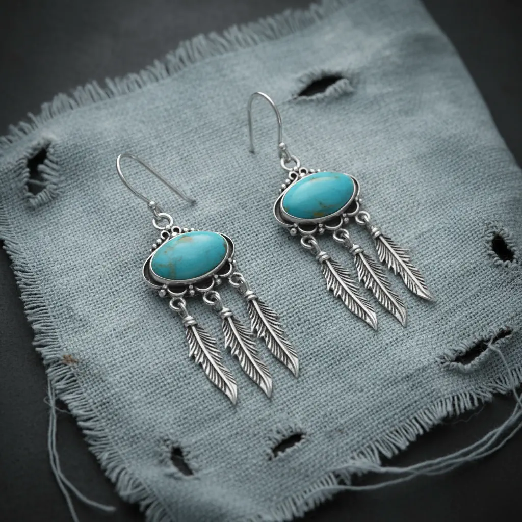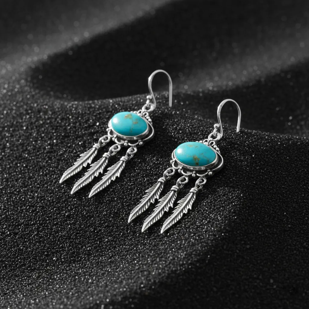 Die eleganten Ohrhänger sind ein Must-Have in jeder Schmucksammlung.Die sinnlichen Ohrhänger veredeln jedes Frauen Outfit und verleihen der Trägerin beneidenswerte Eleganz.Diese schönen und klassischen Ohrhänger sind aus 925 Sterling Silber gefertigt und mit Türkis Steinen verziert.Der coole Silberschmuck im angesagten Indianer Design darf in keinem Schmuckkästchen fehlen!